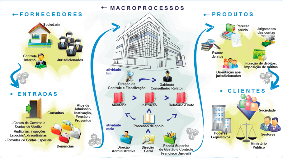 Esta imagem demonstra graficamente quais são os principais insumos (entradas) do TCE-RS, o fluxo simplificado de como eles tramitam entre os diversos setores e quais são os produtos gerados. É uma representação genérica que, além de mostrar essas entradas e saídas, demonstra também quem são os fornecedores e clientes do TCE-RS.