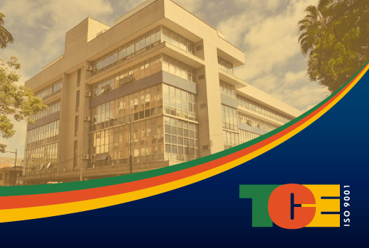 Audiodescrição: A imagem é levemente amarelada e mostra o prédio do TCE-RS. Na parte inferior, há um detalhe em azul escuro, com a borda superior nas cores da bandeira do Rio Grande do Sul: verde, vermelho e amarelo. Dentro do detalhe, no canto inferior direito, está o logotipo do TCE, também nas cores da bandeira (fim da descrição).