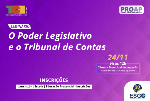 O Tribunal de Contas do Estado (TCE-RS), através da Escola de Gestão e Controle Francisco Juruena, promove o Seminário “O Poder Legislativo e o Tribunal de Contas”. O evento destinado para vereadores, procuradores, diretores de câmaras de vereadores, assessores legislativos e controladores internos que ocorre sexta-feira (24) na Câmara Municipal de Jaguarão, a partir das 9h. O presidente do TCE-RS, conselheiro Alexandre Postal participará da abertura do evento .