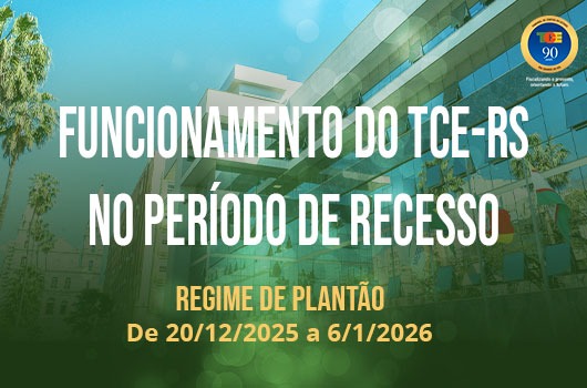 O Tribunal de Contas do Estado (TCE-RS) estará de recesso de 20 de dezembro de 2025 a 6 de janeiro de 2026. Também ficam suspensos os prazos processuais no período de 20/12/2025 a 20/01/2026, conforme disposto em resolução (RES nº 1.067/2016).