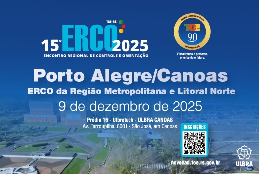 O Tribunal de Contas do Estado (TCE-RS) realiza, no dia 9 de dezembro, a 15ª edição dos Encontros Regionais de Controle e Orientação (ERCOs) na cidade de Canoas. O evento ocorrerá das 9h às 17h30, no auditório da Ulbra Tech da Universidade Luterana do Brasil (Ulbra), na Av. Farroupilha, 8001 - São José, Canoas.