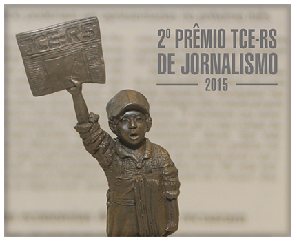 Audiodescrição: fundo com jornal desfocado. Em destaque está a parte superior da estátua - “O Jornaleiro” - oferecida aos vencedores do Prêmio de Jornalismo do TCE-RS: A imagem que aparece em tom de bronze é a de um menino vendedor de jornais, usando um boné, com um maço de exemplares embaixo do braço esquerdo, pressionado contra o corpo e um jornal erguido com o braço direito levantado. Neste jornal pode-se ver no espaço do título a sigla “TCE-RS”. Ao lado do menino, na parte superior direita da imagem, está escrito “2º Prêmio TCE-RS de Jornalismo 2015”, em letras cinza.